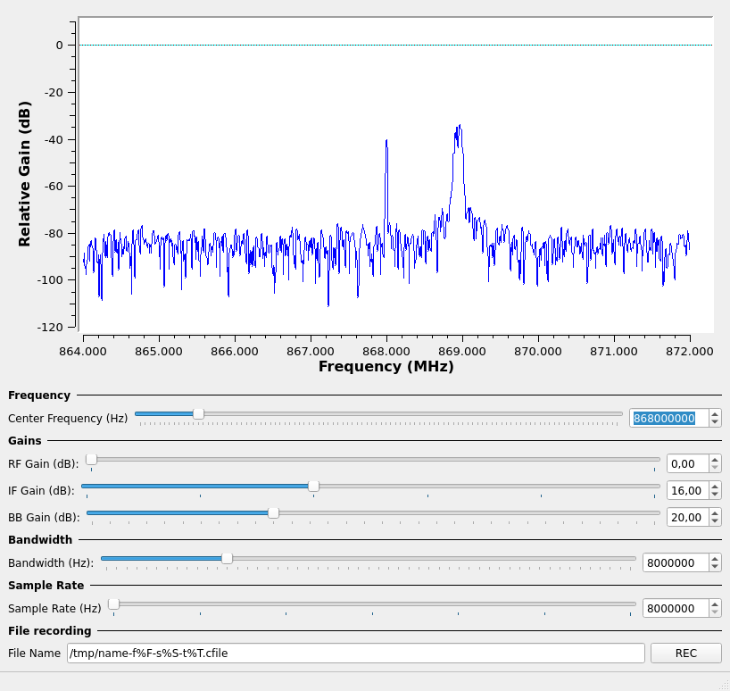 Pour commencer, il faut trouver la fréquence utilisée par la télécommande. Il s’agit probablement d’une fréquence IMS. Nous utiliserons l’outil osmocom_fft, du paquet gr-osmosdr. Nous indiquons le périphérique à utiliser (hackrf) et la fréquence approximative (ici : 868MHz). La commande osmocom_fft -a hackrf -f 868e6 ouvre une fenêtre. En appuyant sur un bouton de la télécommande, nous voyons apparaître une raie situé à 868,92MHz.