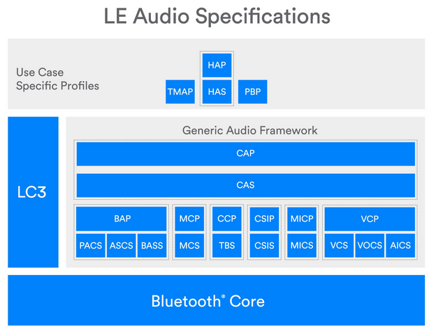 Le BLE audio est capable de diffuser le flux sonore vers un nombre quelconque de récepteur. Sur le site Bluetooth, il est mentionné la technologie Auracast et propose un nouveau codec plus performant Low Complexity Communications Codec (LC3).