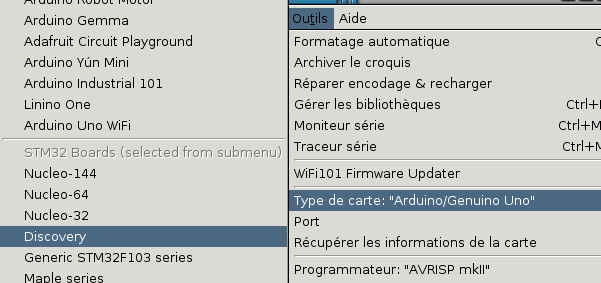 L’autre élément qui peut être délicat, c’est que le téléversement pour Arduino se fait par une connexion série. Pour les stm32, ceux ci apparaissent comme une clef usb. Il suffit de copier le fichier exécutable dans le répertoire et il est exécuté automatiquement. Le message d’erreur indique (mais pas de manière claire) que le répertoire n’est pas monté :