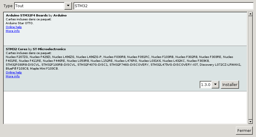 Ensuite, il faut aller dans Outils=>Type de carte=>Gestionnaire de cartes, filtrez par STM32, et installez STM32 cores by ST, figure 2.13.