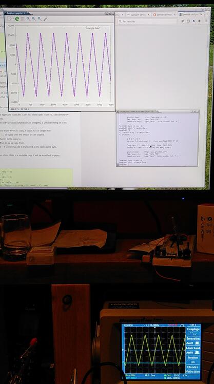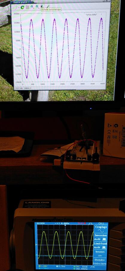 Après un petit travail cosmétique, gnuplot affichera des courbes similaires à ce qu’on voit sur l’écran. La figure 24.5 montre un signal sinusoïdal sur l’écran de l’oscilloscope et sur l’écran de l’ordinateur.