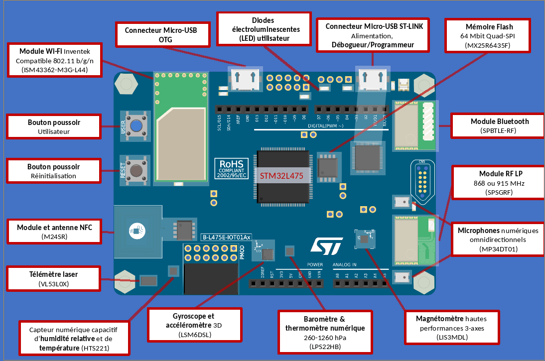 Il s’agit en fait d’une collection de cartes différentes. Celle qui nous interresse est la B-L475E-IOT01A, STM32L4 Discovery kit IoT node, la documentation est sur la page Iot Node. La photo de la carte est présentée figure 25.6.