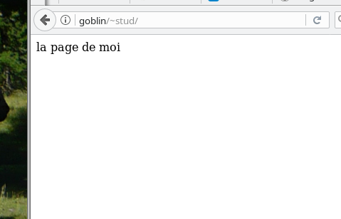 stud@goblin:~$ mkdir public_html stud@goblin:~$ cd public_html/ stud@goblin:~/public_html$ echo la page de moi > index.html stud@goblin:~/public_html$