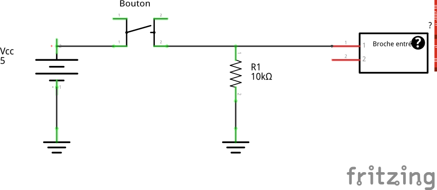 Si le bouton est ouvert, alors l’entrée est connectée à la masse à travers une résistance de . Le microcontroleur détectera le niveau bas. Si le bouton est pressé, alors l’entrée sera connectée à