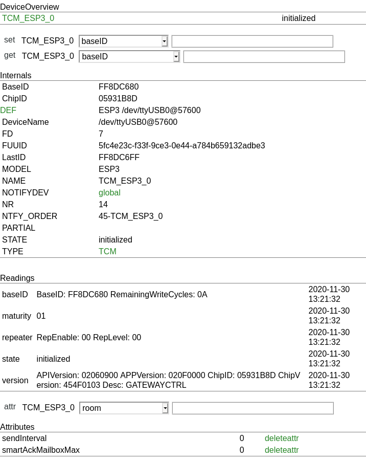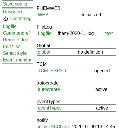 Il est alors possible d’insérrer la clef usb. Après avoir relancé le serveur fhem, l’onglet Unsorted affiche son existence (figure 5.9). C’est alors parfois le drame. il se peut qu’il n’y aie pas de baseID…Après un reboot de l’ordinateur, la baseID est arrivée. La clef est alors détaillée dans la figure ??.