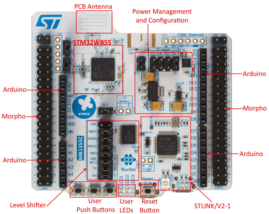 La figure 5.16 présente les cavaliers (jumpers) du WB55. Dans le carré rouge labellisé Power Management, le cavalier 2 permet de mesurer le courant.